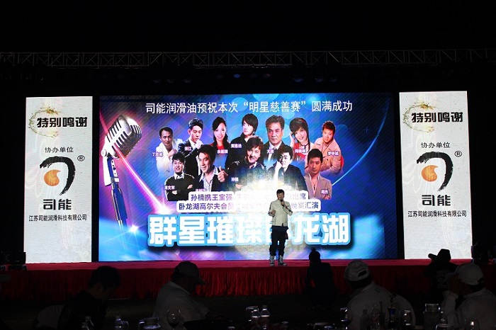 ? ? ? ?2014年12月15日晚,柳州臥龍湖高爾夫俱樂部隆重舉辦開業周年慶典暨會員“明星慈善邀請賽”,孫楠、王寶強、朱時茂等十幾位明星齊聚柳州臥龍湖。高爾夫賽事、慈善晚宴、文藝匯演,司能潤滑油作為協辦單位傾情傾力,與群星共同呈現了一場璀璨搖曳的視聽饕餮盛宴。