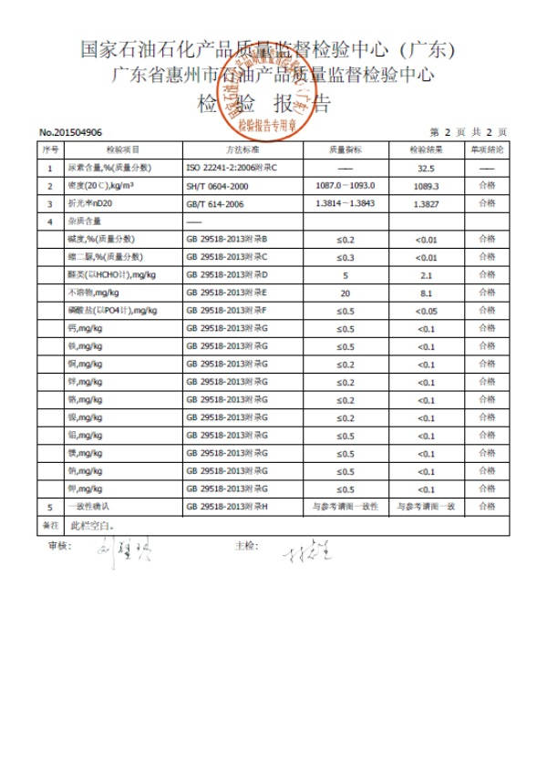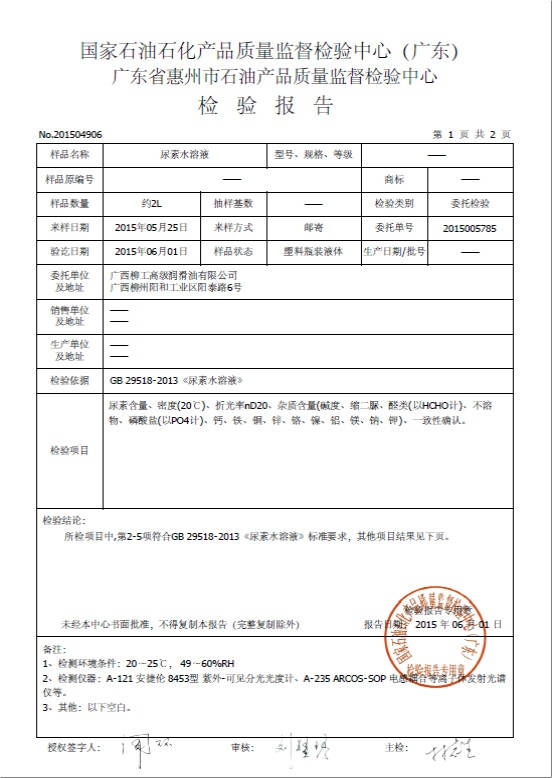 ? ? ? ? 2015年6月1日,我司的“馭藍柴油尾氣處理液”通過了第三方——國家石油石化產品質量監督檢驗中心(廣東省惠州市石油產品質量監督檢驗中心)的檢測,其中多個檢測項目包括:密度、折光度、堿度、縮二脲含量、醛類指標、不溶物含量、磷酸鹽含量,檢測出來的指標都遠遠低于國家規定標準,其他的重金屬鋁、鈣、鉀、鈉、銅、鐵、鎂、鎳、鋅、鉻都均未檢測出來,就連紅外定性也與標準譜圖一致,相關技術指標均符合國家GB 29518-2013《尿素水溶液》的嚴格標準,最后“馭藍”順利地拿到了合格的檢測報告。