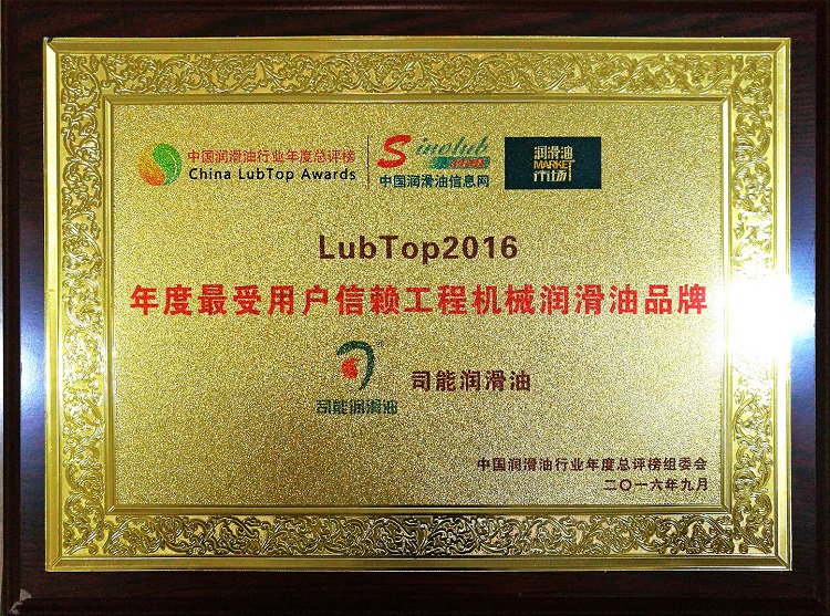9月19日,由中國潤滑油信息網、《潤滑油市場》雜志發起主辦,中國國際潤滑油品及應用技術展覽會聯合主辦的“LubTop2016 中國潤滑油行業年度總評榜”在廣州朗豪酒店隆重舉行。司能石油化工有限公司受邀出席本次盛會,并在會上榮獲“最受用戶信賴工程機械潤滑油品牌”大獎。